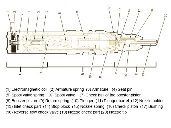 El inyector HEUI integra múltiples funciones. En primer lugar, puede presurizar el combustible suministrado a un amplio rango de 450 kPa a 175 MPa. En segundo lugar, el principio de funcionamiento del inyector de combustible es similar al del pulverizador, que pulveriza con precisión combustible de alta presión a través del orificio en la punta. Además, los inyectores HEUI pueden garantizar que una cantidad apropiada de combustible atomizado se inyecte con precisión en la cámara de combustión y se disperse uniformemente.