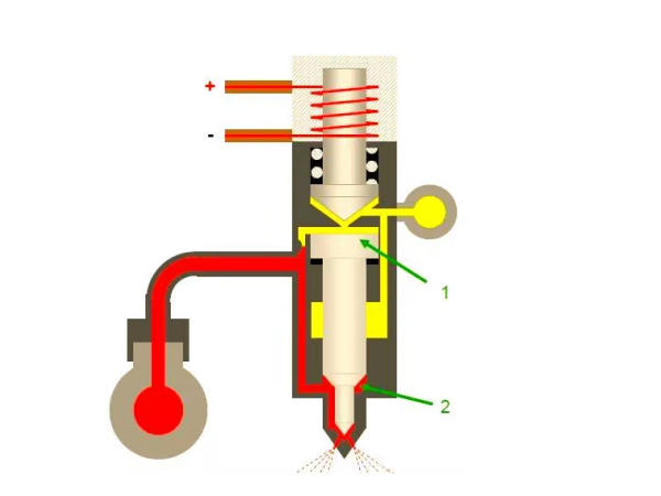 Cuando el ECM determina que actualmente no se requiere inyección de combustible, corta el suministro de energía a la válvula solenoide del inyector. A continuación, al desaparecer la fuerza electromagnética, el núcleo de la válvula solenoide regresa al estado cerrado por acción de la muelle, cerrando así el canal de descarga de aceite. En este momento, la presión en la superficie superior del émbolo comienza a aumentar, empujando al conjunto del émbolo y la válvula de aguja a volver a su posición inicial, poniendo fin a la inyección de combustible.Al mismo tiempo, este cambio de presión hace que la misma presión de combustible actúe nuevamente sobre la superficie superior del émbolo y la protuberancia de la válvula de aguja. Debido al mayor área de acción sobre dicha superficie, se genera una fuerza más elevada hacia abajo, lo que permite mantener firmemente la válvula de aguja del inyector en posición cerrada hasta que el ECM emita la siguiente orden de inyección de combustible.