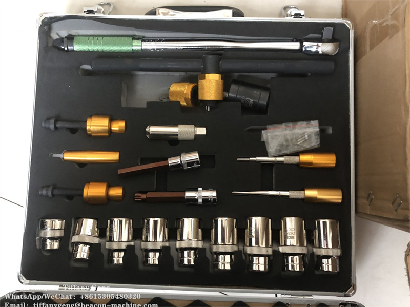 Incluye: llave de tubo para apretar el asiento de la válvula solenoide, herramienta para quitar la tuerca del conjunto de la válvula, llave de tubo para apretar la tapa de la boquilla de aceite, llave de tres mordazas Denso, llave Komatsu, llave de cruz Caterpillar, extractor de sellos de aceite, ensamblador de sellos de aceite, soporte simple para quitar y ensamblar inyectores, etc.